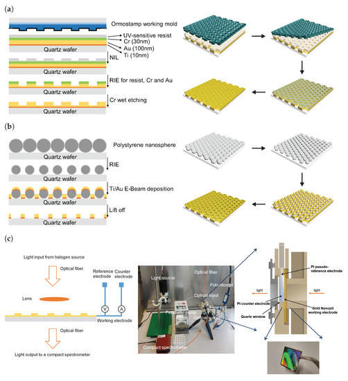 Schematic representation of the fabrication of AuNpA based on nanoimprint lithography (a) and full AuNhA based on nanosphere lithography (b). Schematic of the simultaneous plasmonic and electrochemical dual signal measurement set-up (c).