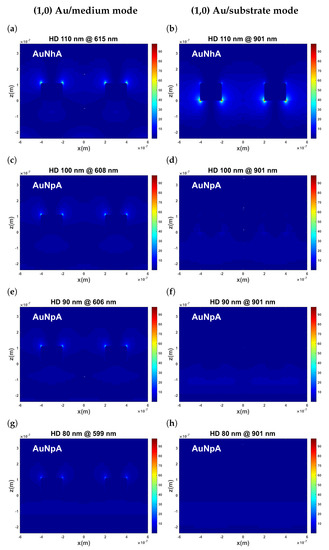 In order to verify our assumption, we systematically investigated the influence of the hole depth (HD) changing from 80 nm to 110 nm on the spectrum with FDTD spectrum simulations (Figure 3). For the fully penetrating hole structures (HD = 110 nm), the highest electric field intensity was observed at the top of the gold ring hole for the (1,0) Au/medium mode at 615 nm. Importantly, the confined local electromagnetic fields at the top gold surface extended from the electrode’s vicinity into the medium, which contributed the most to the local refractive index changes during the analyte sensing process. In contrast, for the (1,0) Au/substrate mode at 901 nm, the nearfields were mostly concentrated at the Au and quartz interface, meaning they played a minor role in the biomolecular recognition reactions and the surface binding events.
