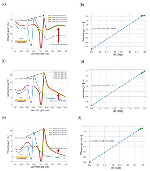 As the HD decreased, the Au/substrate mode’s intensity also decreased. When the HD reached 80 nm, there was still a 20 nm continuous Au layer on top of the 10 nm Ti. The electric field of the Au/substrate mode can barely be seen, indicating that this mode was effectively suppressed. At the same time, the Au/medium mode intensity remained nearly constant, as expected. We also simulated the spectrum for dielectric media of different refractive index (air (1.0) and water (1.33)) as shown in Figure 4 and Figure S2e,f. The (1,0) Au/medium mode became more distinct, especially compared with the spectrum of the fully penetrating hole configuration. For an HD of 100 nm, there were still faint Au/substrate mode peaks around 1000 nm. Although the transmittance decreased to some extent, the refractive index sensitivity was more important for the wavelength shift sensor, which increased when the HD decreased from 100 nm to 80 nm, as shown in Table 2. Overall, the change in the sensitivity was relatively small for the HD, while the FWHM varied considerably. Consequently, a thickness of 90 nm or 80 nm seems to be a reasonable compromise between the transmittance and FWHM, because a low transmittance causes high noise levels and impairs peak fitting.