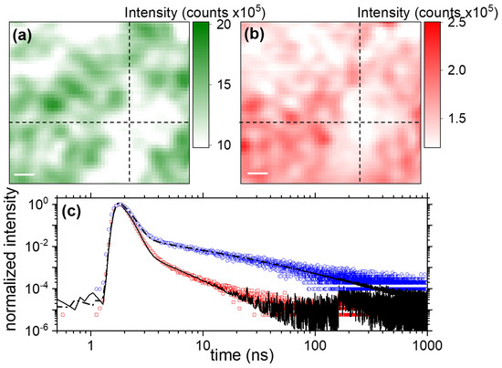 (a,b) 9 × 9 m, 50 × 50 pixel, PL microscopy obtained at an excitation wavelength = 445 nm, a repetition rate = 500 kHz and an intensity of 40 nW/m. The PL signal is filtered for DET1 at 550–555 nm (a) and for DET2 at 568 ± 5 nm (b). The PL intensity is presented as a linear colorscale. Integration time per pixel was 10 s. (c) Decay curves extracted from the pixel at the intersection of the two black dashed lines in (a,b). The data are presented in log-log scale. The fits performed following Equation (2) are shown as solid black (DET1) and dashed dot line (DET2). The fitting parameters for DET1 are A = 0.71, = 5.5 ns, A = 0.054 = 50 ns and = 0.32. The fitting parameters for DET2 are A = 0.71, = 4.2 ns, A = 0.071 = 50 ns and = 0.22. The signal increase at time 160 ns, with an amplitude 4 orders of magnitude smaller the maximum signal is an electronic feature of our setup and is fully accounted for by the IRF (see Supplementary Materials, Figure S4). Integration time per pixel was 10 s.