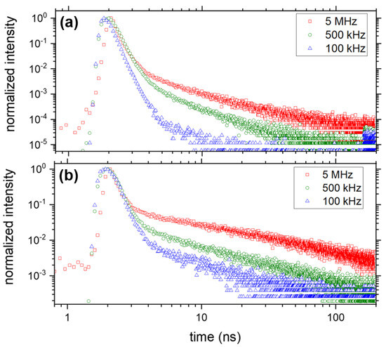 Decay curves obtained on the same pixel as Figure 4 for different repetition rates (equivalent ) at = 240 nW/m average excitation intensities: 5 MHz (red), 500 kHz (green) and 100 kHz (blue) for DET1 and signal filtered between 550 and 555 nm (a), and for DET2 filtered at 568 ± 5 nm (b). Integration times were 5 and 10 s for 5 MHz and 0.5/0.1 MHz, respectively.