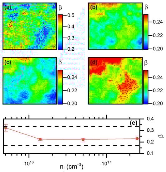 (a–d): A 9 × 9 m, 50 × 50 pixel image of Zone 2 where a pixel takes the value of the fitting parameter from Equation (2) represented as a colorscale, for (a), (b), (c) and (d). (e): Average value of calculated over the complete images (a–d) for different values of . The dashed lines represent value of for 2D (top line) and 1D Förster direct transfer (bottom line) when all the defect distribution is available for diffusion (no truncation to nearest neighbor).