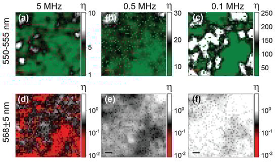 9 × 9 m, 50 × 50 pixel image of Zone 2 where a pixel takes the value calculated for from Equation (9) represented as a colorscale. (a–c) Obtained from DET1 (550–555 nm) for repetition rates 5 MHz ((a), = 5 × 10 cm), 500 kHz ((b), = 5 × 10 cm) and 100 kHz ((c), = 2.5 × 10 cm). (d–f) The corresponding values of obtained for DET2 (568 ± 5 nm).