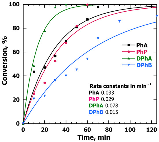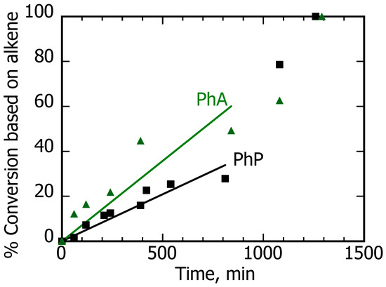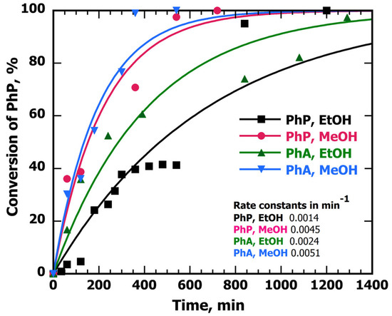 In an attempt to improve the kinetics, we tried using a different solvent that may help to maintain the selectivity toward the alkenes and reduce reaction times [23]. According to this, MeOH was used as the hydrogen donor/solvent given its promising results in catalytic hydrogenation reactions. Hence, keeping the same conditions of the semi-hydrogenation reactions, Figure 7 shows the time profiles for PhP and PhA when performing the semi-hydrogenation reactions in EtOH and MeOH.
