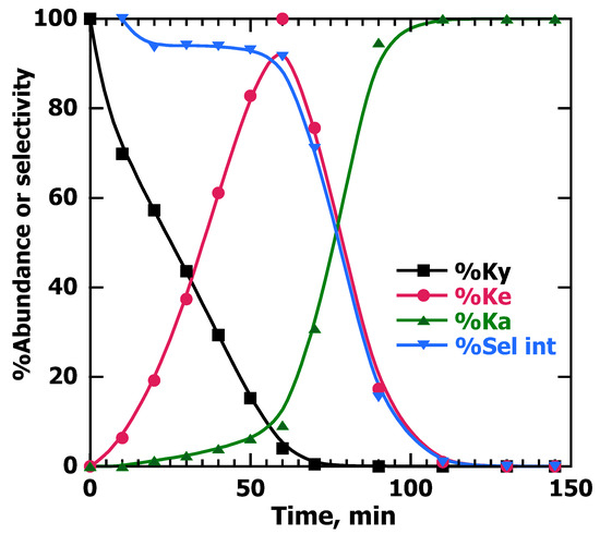 Abundance of the PhP (%Ky), along with alkenes (%Ke) and alkane (%Ka), and selectivity toward the alkenes (%Sel int) vs. time for 8 mL of a 6 mM solution in EtOH of PhP stirred with 10 mg of Pd@TiO2. The reaction was performed in a Pyrex test tube with a rubber cap and irradiated with 25% UVA power under Ar. At 60 min, the abundance of the alkyne was more than 95% and the selectivity toward alkenes was 91%. Only 10 min longer made the selectivity 70% at 70 min.