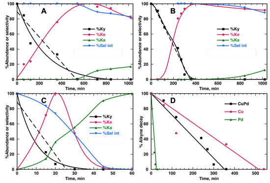 Continuing with the analysis of Figure 4, it is worth highlighting that at times slightly longer than that required for alkyne consumption, the selectivity was reduced to 70% at 70 min and an additional 20 min reduced it to less than 20% (see “%Sel int” in Figure 4). This brings in the concept of critical timing, where in this case, it is not possible to achieve reasonable selectivity given that the reaction is very fast, and thus, stopping it at a very precise time might be difficult when working with Pd@TiO2. It is possible to use Palladium catalysts for semi-hydrogenation, but the time at which the reaction must be stopped requires critical timing and an error of just a few minutes induces extensive over-hydrogenation to the alkane product.