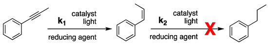 Reaction path for semi-hydrogenation of 1-phenyl-1-propyne (PhP) using a photocatalyst. In an ideal situation k2 << k1.
