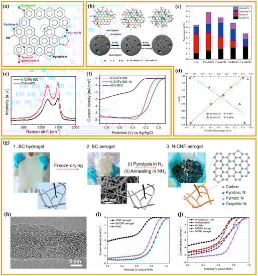 (a) Several different types of N-configurations in N-doped carbon. Copyright 2021 by the Royal Society of Chemistry from reference [77]. (b) Schematic mechanism of the possible role of KOH in ORR. (c) Changes in different N-configuration contents as KOH increases. (d) Linear relationship between the content and ORR activity of pyridine-N and pyrrole-N, respectively. Copyright 2018 by the Elsevier from reference [78]. (e) Raman spectroscopy before and after nitrogen doping. (f) Effect of activation time on the ORR activity of N-CNF by LSV curves. Copyright 2016 by the Elsevier from reference [79]. (g) Schematic diagram of the synthesis of N-CNF aerogels. (h) HRTEM image of N-CNF. (i) ORR curves of N-CNF aerogel and comparison catalysts. (j) ORR curves of N-CNF aerogel and other NH3-treated carbon materials. Copyright 2015 by the Elsevier from reference [80].
