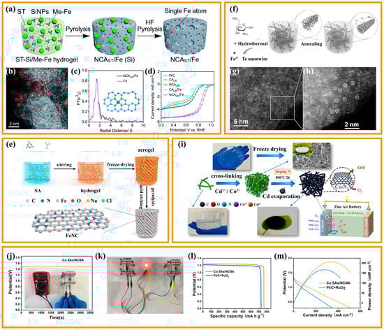 Although Fe single-atom catalysts exhibit better catalytic activity and fuel cell performance among non-precious metal catalysts, a two-electron side reaction is inevitably carried out in the actual process to produce hydrogen peroxide. The interaction between hydrogen peroxide and Fe2+ or Fe3+ leads to the production of hydroxyl radicals by the Fenton reaction. These active hydroxyl radicals will attack the surrounding carbon or metal active centers, and in turn cause performance degradation. Meanwhile, these active hydroxyl radicals will also attack the polymer diaphragm, leading to battery performance degradation. Therefore, non-precious metal single-atom catalysts with weak Fenton effect and high activity have been expected. Shen et al., proposed a feasible method to construct metal-chelated TOCNFs-Cd2+/Co2+ aerogel precursors using cellulose nanofibers, and synthesized N-doped carbon nanofiber aerogel-based single cobalt atom catalysts (Co-SAs/NCNA) by eliminating volatile metal cadmium and doping additional nitrogen during direct calcination (Figure 5i) [91]. Due to the presence of a multitude of exposed active metal atomic sites and a conductive network with high-speed electron/mass transfer channels within the 3D porous CA, the Co-SAs/NCNA produced shows higher ORR kinetics (Eonset = 0.98 V, E1/2 = 0.86 V) under alkaline conditions and has excellent performance (206 mW·cm−2 of high maximum power density, 769 mAh·g−1 of specific capacity) when used as air cathodes in ZAB devices (Figure 5j–m).