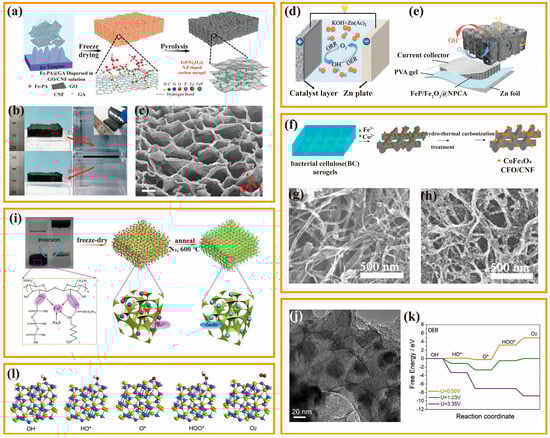 (a) Schematic diagram for synthesis of the FeP/Fe2O3@NPCA. (b) Comparison photos of FeP/Fe2O3@NPCA before and after compression. (c) SEM image of FeP/Fe2O3@NPCA. (d,e) Schematic diagram of aqueous rechargeable and solid-state ZAB. Copyright 2020 by the Wiley from reference [92]. (f) Schematic diagram for the synthesis of CFO/CNF nanocomposite. (g,h) SEM images of CFO/CNF nanocomposite. Copyright 2016 by the Elsevier from reference [93]. (i) Schematic diagram for the synthesis of Co9S8/N, P−APC. (j) TEM image of Co9S8/N, P−APC. (k) OER free energy diagrams at different potentials. (l) Several different reaction intermediates configurations. Copyright 2019 by the Elsevier from reference [16].