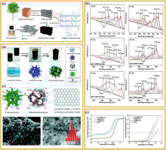 This review aims to look into the potential of reliable and commercial approaches for ORR and OER electrocatalysis using biomass-based carbon aerogels. In recent years, several reviews have focused on CAs and electrocatalysis. Peles-Strahl et al., offered an overview of the recent developments and trends in aerogels-supported ORR catalysts, including different aerogel structures (CA and metal aerogels) [20]. Huang et al., presented advances in atomic-scale modulation and the nanostructure design of carbon-based bifunctional oxygen catalytic materials for metal–air batteries [21]. Shao et al., provided a comprehensive review on the customization of nanostructured carbon-based electrodes and carbon carrier design for ZAB. In this study, we focused on carbon-based catalysts, that is, CAs derived from biomass [22]. First, the preparation and characterization of biomass-based CAs are briefly described, focusing on the reaction mechanisms of the ORR and OER on air electrodes. Afterwards, the performance of various biomass-based carbon-aerogel-based materials developed by the ORR and OER in ZABs is summarized, highlighting the relationship between the active site structure and the electrocatalytic performance in oxygen electrocatalysis. Finally, the opportunities and challenges of biomass-based CAs for electrocatalytic applications are proposed.