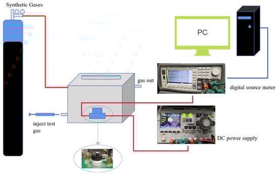 The gas sensitive performance test is carried out in a transparent gas chamber (PMMA) with a capacity of 1 L. The overall test system is shown in Figure 1. The hardware component includes a clear gas chamber, a computer, a tank of synthetic air (21% oxygen and 79% nitrogen), a source/measurement unit (SMU) and an adjustable regulated power source. We used Labview to build the software part. The SMU applies flat voltage (10 V) to the sensor and logs test data at a frequency of 2 Hz. By changing the output of the adjustable regulated power supply to change the temperature around the sensor, because the output of the power source directly acts on the resistance wire.