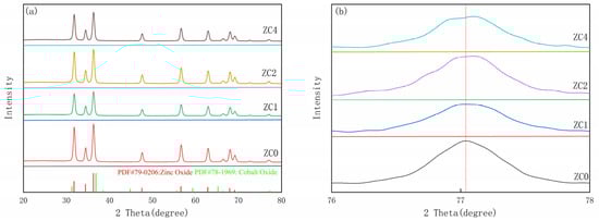 In Figure 2, the XRD data of the ZC0, ZC1, ZC2 and ZC4 samples are matched with zinc oxide hexagonal Wurtzite (PDF#79-0206: ZnO). The diffraction peaks at 31.82°, 34.48°, 36.3°, 47.6°, 56.68°, 62.94°, 66.46°, 68.04°, 69.16°, 72.68° and 77.04° correspond to the (100), (002), (101), (102), (110), (103), (200), (112), (201), (004) and (202) planes of Wurtzite zinc oxide, respectively. Moreover, no diffraction peaks of other elements exist in the XRD spectra of the four samples, indicating that the four materials prepared had good crystallinity. At the same time, the diffraction peaks of the Co-related elements (CoO, Co2 O3 and Co3O4) were not detected, possibly because the doping amount of Co was too low to be detected by XRD [33]. For more characteristics of samples with different cobalt modification ratios, the XRD pattern of the (202) plane was selected for amplification. In Figure 2b, as growth of the cobalt content grows, the diffraction peak deviation angle of the sample increases, which indicates that part of the cobalt ions are mixed into the crystal lattice of zinc oxide. In this process, the main structure of zinc oxide remains unchanged but the crystal face spacing becomes smaller [34].