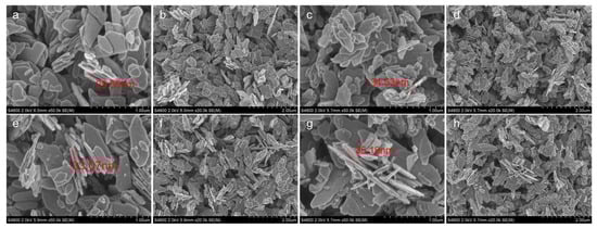 Scanning electron microscope pictures of ZnO nanosheets modified with increased amounts of cobalt in two microscopic sizes: (a,b) ZC0, (c,d) ZC1, (e,f) ZC2 and (g,h) ZC4.