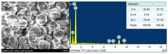 Figure 3a,b is the SEM images of pure zinc oxide. It can be seen that the material presents a monodisperse sheet microstructure, the surface of the nanosheet is smooth and flat, the length is less than 1 μm and the thickness is about 30 nm. Figure 3c–h shows the microstructure of ZC1, ZC2 and ZC4, respectively. It can be seen that the modification of cobalt does not affect the lamellar structure of the material, and the cobalt nanoparticles are almost uniformly attached to the surface of the zinc oxide nanoparticle without accumulation. With the modification of Co, the thickness of zinc oxide nanosheets is maintained at about 35 nm, which is about 5 nm thicker than ZC0, and its specific surface area will obviously be reduced. At the same time, with the modification of cobalt, the thickness of the cobalt-modified zinc oxide nanosheets decreases first and then increases. It can be seen from Figure 4a that the ZIF-67 consists of polytope with a dimension of 200–500 nm. Figure 4b shows the EDS spectral analysis of ZC2. It shows that the elements in ZC2 included zinc, cobalt and oxygen, and no other impurity elements were found. The mass proportions of O, Zn and Co in ZC2 were 51.73%, 47.76% and 0.51%, respectively, which provided evidence for the existence of Co.