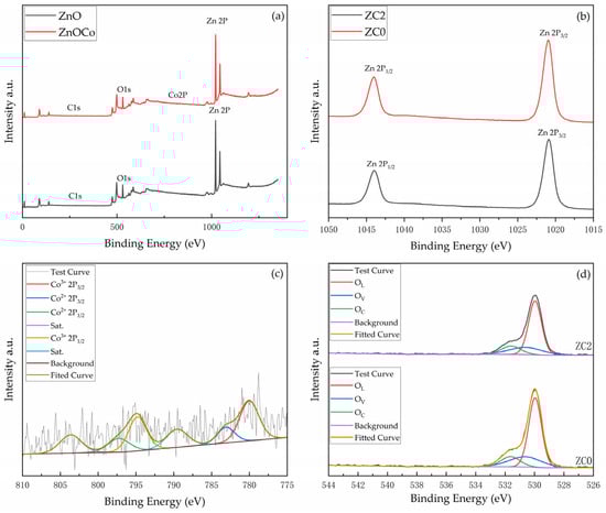 In this paper, XPS was used to further demonstrate the coexistence of Zn and Co and the valence states they present. Figure 6a shows the measured XPS spectra of ZC0 and ZC2. The XPS spectrum of ZC2 shows that four elements, Zn, Co, O and C, are present in the sample and element C is the contamination caused by adsorption during the detection process. Figure 6b shows the precision spectrum of Zn 2p, there is a peak at 1044 eV and 1020.9 eV each, the energy difference is about 23.1 eV, indicating that Zn2+ is normally present in the material [37]. Figure 6c shows the precision spectrum of Co 2p, two peaks at 780.1 eV and 789.5 eV correspond to Co 2p3/2 and Co 2p1/2, respectively. They would be deconvoluted into two peaks. The peak corresponding to Co 2p3/2 consists of Co3+ (779.8 eV) and Co2+ (794.9 eV). The peak corresponding to Co 2p1/2 consists of Co3+ (794.61 eV) and Co2+ (797.26 eV). The difference in binding energy between the two peaks can be observed to be about 15.1 eV, revealing the presence of Co3O4 phase in the sample (ZC2) [38]. The atomic ratio of cobalt found by XPS analysis is 0.41%, which is similar to the result of the EDS measurement of 0.51%. Figure 6d shows the precision spectra of O 1 s showing contents of the lattice oxygen (OL), oxygen vacancy (OV) and adsorbed oxygen (OC) in ZC0 and ZC2. It can be found that the ratio of OC increases from 12% to 14% for ZC2 compared to ZC0. And the ratio of OV decreases from 23% to 18%, which may be due to the combination of cobalt atoms and oxygen vacancies.