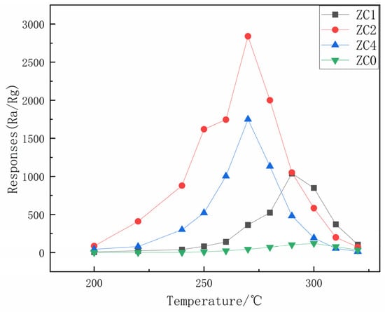 The operating temperature can change the electron mobility of the zinc oxide complex and provide active energy to break the reaction energy barrier for adsorption of the measured gas. Figure 7 shows the sensitivity of ZC0, ZC1, ZC2 and ZC4 at different operating temperatures. When the temperature rises to a critical point, the response value begins to decline; this critical point is the optimal operating temperature of the sensor. According to relevant studies, the reason for this phenomenon can be explained as follows: when the temperature of the sensor is lower than the critical point, it will lack sufficient active energy to promote the surface oxygen anion and 2-butanone REDOX reaction. Therefore, continuously increasing the temperature is a necessary means to find the optimal operating temperature that can provide the activation energy required for the complete reaction of the sensor. On the contrary, the desorption rate of 2-butanone will surpass the adsorption rate and its adsorption active site will also decrease rapidly, thus reducing the response [39]. The best operating temperature of ZC0 is 300 °C; as cobalt is decorated on the zinc oxide nanosheet, its best operating temperature begins to decrease. The best operating temperature of ZC1, ZC2 and ZC4 is 290 °C, 270 °C and 270 °C, respectively. ZC2 shows the best gas sensitivity with a response of 21.17 times that of ZC0 (120) at 270 °C (2540). The decrease of the optimum operating temperature can be owed to the decrease of the reaction energy barrier of adsorption of 2-butanone by the sensor due to the catalytic action of cobalt. The decrease in sensitivity (1749) of ZC4 may be due to excessive Co loading, which leads to the cobalt NPs occupying further active sites on the zinc oxide nanosheet, hindering electron transfer.
