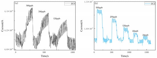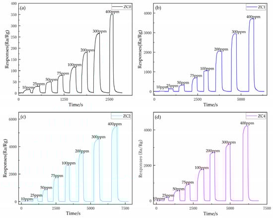 The sensitivity curves of ZC0, ZC1, ZC2 and ZC4 at different 2-butanone concentrations of 10–400 ppm at 300 °C, 290 °C, 270 °C and 270 °C, respectively, are shown in Figure 8a–d. It was found that as the concentration of 2-butanone increased, the sensitivity of all four sensors gradually increased. Under different concentration conditions, the sensitivity of ZC2 was higher than that of other sensors. Figure 7a,b shows the concentration gradient profiles of ZC0 and ZC2 in the detection of ppb level. It was found that the detection limit of ZC0 for 2-butanone is about 500 ppb, while that of ZC2 for 2-butanone is 24 ppb. It indicates that the modification of Co can optimize the LOD of zinc oxide on 2-butanone. At the same time, in Figure 9a,b, the baseline current of ZC2 is much smaller than that of ZC0. This is due to the strong oxygen adsorption capacity of Co nanoparticles, which can catalyze more oxygen ions to be adsorbed on zinc oxide nanosheets. It will greatly improve the primary resistance of zinc oxide and also provide the basic conditions for the improvement of sensor sensitivity [40].