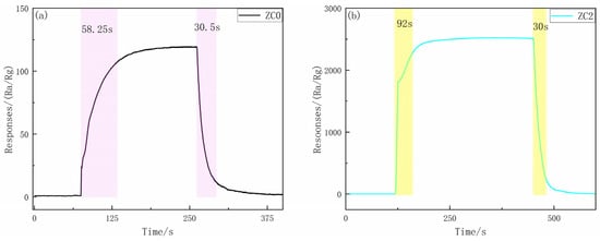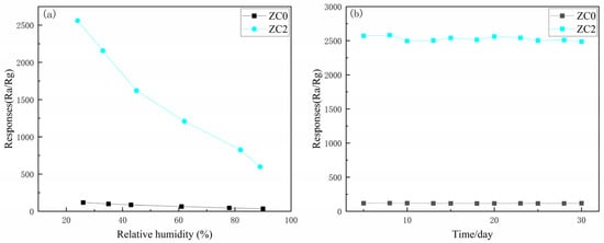 Figure 13a shows the variation in the sensitivity of ZC2 and ZC0 under different humidity conditions. The sensitivity of both sensors decreases with increasing relative humidity, which may be caused by water molecules competing with 2-butanone for adsorption sites on the material surface [42]. In addition, the response of the ZC0 and ZC2 sensors to 100 ppm 2-butanone for 30 days was tested. The result is shown in Figure 13b. There is no significant error change in the sensitivity of ZC0 and ZC2, indicating that both have excellent stability.