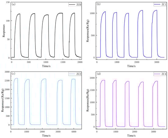 To verify the reproducibility of the sensors, the ZC0, ZC1, ZC2 and ZC4 sensors were measured for five cycles of 2-butanone gas at 100 ppm at 300 °C, 290 °C, 270 °C and 270 °C, respectively. Figure 11a–d shows the test results. The five cyclic response/recovery curves indicate that a single gas sensor has good repeatability.