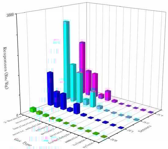 To further analyze the selectivity of ZC0, ZC1, ZC2 and ZC4, the sensitivity of these 100 ppm measured gases (butanone, acetone, methanol, ethanol, ethyl acetate, formaldehyde, acetic anhydride, ammonia, butyl acetate, toluene and xylene) was evaluated by measuring the values. As shown in Figure 12, these sensors are all more responsive to 2-butanone than to other gases. Among them, ZC2 has a higher response to a variety of gases than other sensors and its response to butanone is 2.14 times higher than that of acetone (1211, the second highest response). In the above gas range, the selection ratio of ZC2 (sensitivity ratio of 2-butanone to other gases for comparison) can reach up to 423. The experimental outcomes attest that ZC0, ZC1, ZC2 and ZC4 exhibit good selectivity. The possible reason is that butanone molecules have more hydrogen atoms on the secondary carbon, which can quickly dissociate and react with oxygen ions [41].