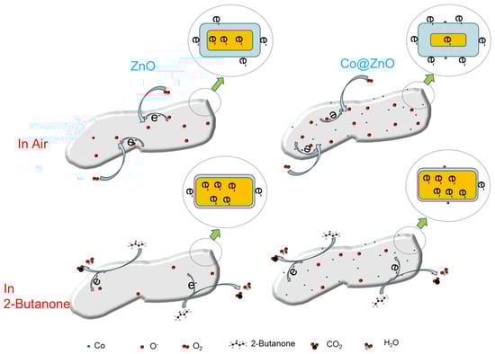 First of all, cobalt oxide, as a p-type semiconductor, is easy to structure the p-n junction on the contact surface with zinc oxide (n-type semiconductor). The electrons of zinc oxide flow to cobalt oxide and the holes of cobalt oxide flow to zinc oxide and finally form the equilibrium of the Fermi level. In the air atmosphere, cobalt oxide will form a hole accumulation layer opposite the electron depletion layer of zinc oxide, which will greatly promote electron flow [23,32]. Therefore, an electron depletion layer wider than that of pure zinc oxide will form at the p-n junction. This will significantly enhance the primary resistance. This will greatly increase the initial resistance of the sensor. This large initial resistance value will greatly optimize the sensor’s earth-gas sensitivity. The REDOX reaction between 2-butanone and oxygen ions will release electrons and neutralize the holes at the same time [52]. This will effectively shrink the electron depletion layer and the hole accumulation layer and the resistance of the sensor will be sharply reduced, showing superior sensitivity. However, the continuous increase of cobalt content can lead to a decrease in sensitivity, which may be due to excessive cobalt NPs occupying a large number of active sites of zinc oxide.