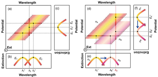 SPR is an optical phenomenon generated by the collective movement of electrons on the surface of metal nanoparticles, and the existence of an electric field will cause the deposition of electroactive molecules on the surface of metal nanoparticles, which will lead to the movement of the plasma formant [28,29,30,31]. Therefore, when the electrochemical signal acts on the plasma nanoparticles, the positive displacement of the potential reduces the density of free electrons in the nanoparticles, leading to a red shift in the peak position of the extinction spectrum, resulting in the electrochemical coupling of the SPR effect. Figure 1a shows the relationship between the wavelength, potential, and extinction spectra of plasma nanoparticles. The two curves in Figure 1b (wavelength extinction spectrum) are the cross-sectional views of Figure 1a at potentials E1 and E2. It can be clearly seen that when the potential increases between E1 and E2, the peak position changes from λ1* move to λ2*. On the other hand, Figure 1c (potential extinction spectrum) shows that at a wavelength of λ3, a new formant can be obtained in the extinction spectrum through potential scanning, and the peak position voltage is E3*. The optical properties of plasma nanoparticles also depend on the refractive index changes of the surrounding medium, resulting in a red shift at the peak position in the wavelength extinction spectrum as the refractive index increases (Figure 1d). Figure 1e shows a cross-sectional view at a potential equal to Ec, showing the peak position from nA to nB as the refractive index increases λA* move to λB*. Meanwhile, Figure 1f shows that at wavelengths of λD, the cross-sectional view at D shows that as the refractive index increases from nA to nB, the peak potential shifts from EA* negative to EB*. Overall, the increase in refractive index change nB − nA will lead to an increase in negative potential shift −(EB* − EA*) and a positive wavelength shift of λB* − λA*.