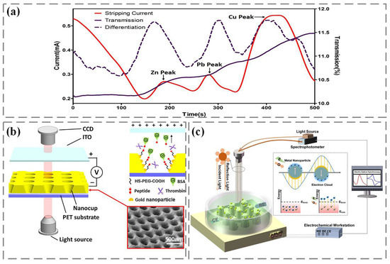 In our previous work, we constructed an electrophoretic-enhanced SPR sensing system. The Au nanocup array is used as an electro-optic sensor, and the transparent indium tin oxide electrode is used as a positive electrode [37]. Direct current is applied between the Au nanocup array sensor and the indium tin oxide electrode. As shown in Figure 3b, using the “sandwich sandwich” strategy, polyethylene glycol with thiol groups is fixed on the surface of the Au nanocup array device through Au sulfur bonds, forming a good biosensitive film. Then, the thrombin specific shear peptide is fixed on the polyethylene glycol biosensitive membrane through amide action. Finally, the end of the peptide chain was modified with negatively charged BSA. When thrombin is introduced onto the surface of the Au nanocup array sensor, the peptide cleavage reaction of thrombin is carried out at a specific position of the polypeptide. With the help of the electric field between the indium tin oxide electrode and the Au nanocup array sensor, the shear peptide and electronegativity of BSA can be separated. Due to the change in the refractive index of the sensor surface, the formant in the transmission spectrum shifted, and the construction of the sensor for determining the catalytic activity of thrombin was completed. In addition, we also modified Au nanoparticles and Ag nanoparticles on the nanocone array by electron beam evaporation and electrochemical reduction deposition, and then carried out linear scanning voltammetry and SPR sensing on the Au/Ag nanocone array sensor to record dynamic electro-optic spectrum signals for sialic acid detection (Figure 3c) [38]. The charge distribution induced by plasma is concentrated on the surface of metal nanoparticles, leading to the excitation of hot electrons and hot holes. If the electron energy exceeds the Fermi energy level of the material, the photoexcited electrons will generate light emission through electron-electron or electron-phonon collisions. Then light absorption and SPR will be generated on the nanosensor, accompanied by electromagnetic attenuation on the femtosecond scale, and energy will be transferred to hot electrons in a non-radiative manner.