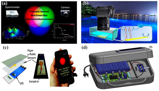 Luminescent detector: (a) Red-green-blue ECL using a digital camera as the detector [86]. (b) Digital camera visualization with a radio luminescence array [87]. (c) Paper-based microfluidics electrodes and smartphone-based ECL detection platforms [88]. (d) Handheld ECL detection platform [89].