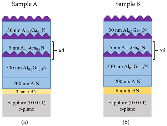 The growth of h-BN templates with thicknesses of 3 nm and 6 nm was performed using an Aixtron MOVPE close-coupled showerhead (CCS) reactor on (0 0 0 1) sapphire substrates. The process was carried out at a temperature of 1280 °C and a pressure of 90 mbar. Triethylboron (TEB) and ammonia (NH3) were employed as precursor gases for boron (B) and nitrogen (N), respectively. More comprehensive information on the growth conditions for h-BN can be found in previously published reports [15]. The growth of AlxGa1-xN/AlN structures on the h-BN templates was performed using MBE in a RIBER 32P reactor. Solid sources of the III-elements (Al, Ga) and NH3 as a nitrogen source were utilized, except for the QD active region where NH3 was replaced by a nitrogen (N2) plasma source. This substitution was necessary to enable the formation of QDs and 3D islands, as NH3 would result in a 2D growth mode that inhibits their formation [16]. Under N2, a 2D–3D “Stranski–Krastonov” growth mode can be achieved [16,17], allowing for the growth of AlyGa1-yN QDs on AlxGa1-xN (with x > y). Two structures, known as sample A and sample B, were fabricated (see Figure 1). The fabrication process for both samples was similar, except for the thickness of the AlxGa1-xN layer. For both samples, a 200 nm thick AlN layer was initially grown with the following conditions: a 10 nm thick AlN buffer layer was grown at 1070 °C with an ammonia flow rate of 50 sccm and a growth rate of 50 nm/h. Subsequently, the 200 nm AlN layer was grown at 1120 °C with an ammonia flow rate of 50 sccm and a growth rate of 100 nm/h. Following this, a 500 nm thick Al0.7Ga0.3N layer was grown at 870 °C for sample A and a 330 nm thick layer for sample B, both at a growth rate of 290 nm/h. Next, an active region consisting of six Al0.3Ga0.7N QD planes with an Al nominal composition (n.c.) of 0.3, separated by Al0.7Ga0.3N barriers lattice matched to the Al0.7Ga0.3N template, was deposited. The equivalent 2D thickness of the Al0.3Ga0.7N (n.c.) QDs was 7 monolayers (MLs), approximately 1.8 nm, with 1 ML corresponding to half the c-lattice parameter, considering a variation of the lattice parameter following Vegard’s law between AlN and GaN. In between the QD planes, 5 nm thick Al0.7Ga0.3N cladding layers were grown for both samples. After the deposition of the fifth QD plane, a 30 nm thick Al0.7Ga0.3N layer was grown at 820 °C. Finally, the sixth and last QD plane was deposited on the surface of the top cladding layer for both samples.