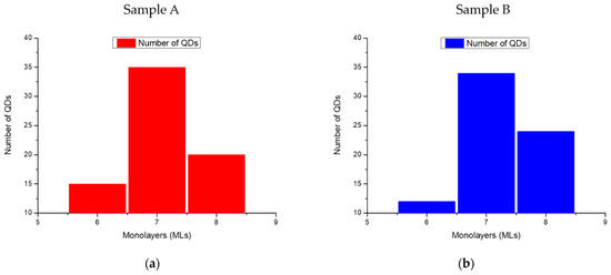 Figure 3. Histograms showing the QDs’ height distributions as a function of monolayer (ML) units (1 ML = 0.257 nm) for (a) sample A and (b) sample B.