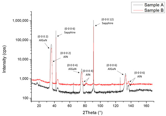 For both samples, only the (0 0 0 1) orientation was observed for nitride layers: at 36° the AlxGa1-xN and AlN (0 0 0 2) peaks were mingled. The AlxGa1-xN and AlN (0 0 0 4) peaks were seen at 75.3° and 76.5°, respectively. The AlxGa1-xN and AlN (0 0 0 6) peaks were well separated at 132.9° and 136.38°. The thinner peaks correspond to the sapphire substrate: the (0 0 0 6) and (0 0 0 12) reflections were observed with high intensities and three forbidden reflections of sapphire were detected. It should be mentioned that two peaks, observed at 17.8° and 44.4°, came from the sample holder itself since the studied samples are smaller than the X-ray beam footprint.