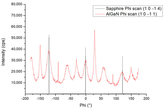 Figure 5. XRD Phi scan performed on sample A along the (1 0 1 1) and the (1 0 1 4) skew planes for Al0.7Ga0.3N and sapphire, respectively.