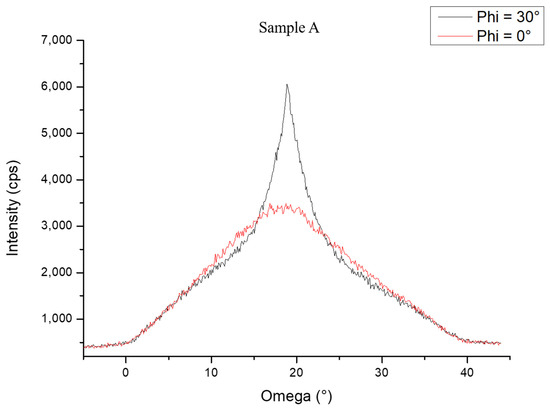 Figure 6. XRD omega scan along the AlGaN (1 0 1 1) skew plane for sample A chosen from two different Phi peaks (0° and 30°).