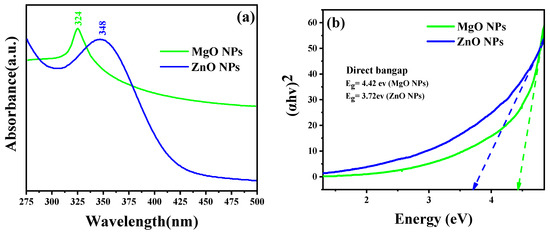 As the absorption bands of simples are related to the diameter and aspect ratio of metallic NPs, UV–Vis absorption spectroscopy is the most useful technique for characterizing their optical characteristics and electronic structure [26]. In this study, the prepared MO NPs were confirmed by UV–Vis spectroscopy. Radiation with wavelengths between 300 and 800 nm is commonly used to characterize various metallic NPs with sizes between 2 and 100 nm [27]. The UV–Vis spectra of MgO NPs and ZnO NPs were acquired for the 250–800 nm spectral range, as shown in Figure 2. The prepared samples’ colloidal solutions were kept at 25 °C for 24 h. The ZnO sample clearly demonstrated that the maximum absorption peak appeared at 348 nm, which is reported for ZnO NPs with the hexagonal wurtzite structure [25]. The UV–Vis spectrum of the MgO sample also displayed a single absorption band at 324 nm. Based on Equation (2), it was determined that the optical band gap energies of the ZnO NPs and MgO NPs at the maximum absorption peaks were 3.72 eV and 4.42 eV, respectively.