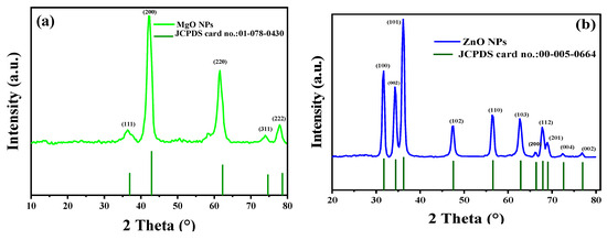 The MgO and ZnO NPs’ phases and crystal structures were described using XRD analysis. As shown in Figure 4, the XRD pattern of MgO NPs revealed five significant peaks at 36.51°, 42.10°, 61.51°, 74.02°, and 77.95°, which, respectively, represent the (111), (200), (220), and (311) planes. The XRD pattern revealed that the synthesized MgO NPs were cubic in structure and crystalline in nature, according to the Joint Committee on Powder Diffraction Standards (JCPDS file no. 01-078-0430) [35]. It was also noted that the last three peaks could be indexed to the hexagonal crystal structure of MgO NPs. The crystal size was calculated using Scherrer’s formula, with the particle size around 4.83 nm. Almost similar XRD results were reported for MgO NPs prepared by other biogenic materials [35,36,37,38,39,40].