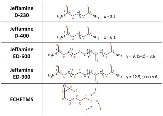Commercial reagents [2-(3,4-epoxycyclohexyl)ethyl]trimethoxysilane (ECHETMS) (98%, Sigma-Aldrich, St. Louis, MO, USA), Jeffamines® D-230, D-400, ED-600, ED-900 (Huntsman Corporation, Pamplona, Spain), and solvent acetonitrile (ACN, Fisher Scientific, Loughborough, UK) were used as received. A Millipore water purification system (Milli-Q®, Merck KGaA, Darmstadt, Germany) was used to obtain high-purity deionized water (resistivity > 18 MΩ cm).