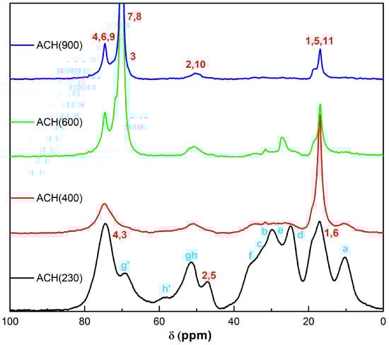 Starting from the ACH(230) sample, its spectrum shows the presence of all the signals of the two reagents (Figure S1a,b) with some modifications. In particular, the reaction between Jeffamine and the silane causes the ECHETMS partial ring opening, proved by the presence of two new resonances at 69 and 58 ppm (g’, h’), with respect to the original g and h that fall in the broad resonance at about 51 ppm. The h’ chemical shift, attributable to the C-N bond, together with the shoulder at 35 ppm, attributable to a slight downfield shift of f, could support the reaction between the epoxide and the amino groups of the Jeffamine [23]. Moreover, the chemical shift of a at 10 ppm and the absence of a sharp peak (methoxy, i) at 50 ppm speak for fully hydrolyzed and condensed Si units of the ECHETMS.