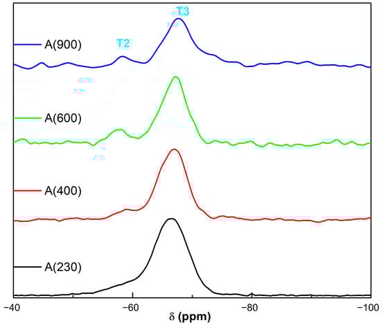The 29Si MAS NMR spectra recorded in OIH samples are shown in Figure 4, where the typical signals of T units (from −50 to −80 ppm) belonging to the trialkoxysilanes present in the different samples are visible (as reported in the Experimental Section: Tn states for trifunctional SiCO3 units and n the number of siloxane bridges). The results of the profile fitting analysis are reported in Table 1. It appears that these OIH samples present only T2 and T3 units, whose resonances fall at −58 and −66 ppm, respectively, and a high value of the degree of condensation (DOC), always above 94% (Table 1). This parameter was calculated according to the following equation [24]: