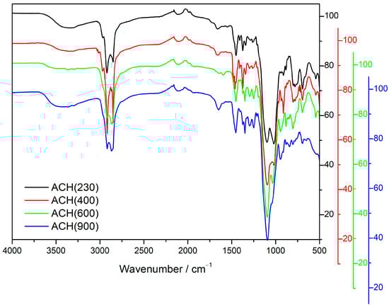 Fourier Transform Infrared Spectroscopy (FTIR) was performed for the four new materials to complement the structural characterization performed using ssNMR. Figure 5 shows the FTIR spectra for the four aminoalcohol materials. All four spectra show two strong bands at around 2850–2860 and 2915–2925 cm−1, characteristic of C–H stretching vibrations [14,25,26,27,28]. These bands are typical of the organic part from the Jeffamine moiety. The spectra of ACH(230) and ACH(400) show a small peak at around 2970 cm−1, which is related to C–CH3 asymmetric stretch and is more significant in these two OIHs due to the higher percentage of PPG units. Regarding C–H bending vibrations, the signals can be found at 1450, 1375, and 1350 cm−1; the signal at 1375 cm−1 can be assigned to the C–CH3 bond, which is once again more prominent in A(230) and A(400) hybrids.