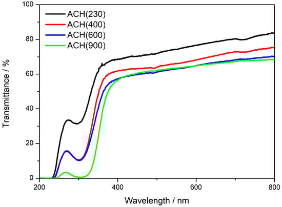 UV/Vis spectroscopy was performed to assess the optical properties of the materials. Figure 6 shows the transmittance spectra for the four new OIH materials. All spectra show a high-transmission region between 350 and 800 nm, as expected for these types of materials [14,15,26]. It is possible to assess that the transparency is higher in the samples with the lower Jeffamine MW, which is according to the information already reported in the literature for OIH materials synthesized with Jeffamine precursors [34]. At 400 nm, the four xerogels show transmittance values of 56%, 57%, 62%, and 68%, for ACH(900), ACH(600), ACH(400), and ACH(230), respectively. The transmittance values slightly increase with higher wavelengths, which is also in agreement with previous reports [9,15,34,35].