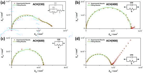 Nyquist plots for the new OIH sol-gel matrices: (a) ACH(230); (b) ACH(400); (c) ACH(600); and (d) ACH(900).