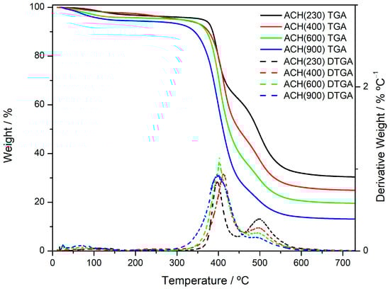 Figure 8 shows TGA and DTGA traces for the four OIH matrices. Table 5 shows the 5% weight loss temperature (T5), the temperature of the maximum rate of weight loss (Tmax), the activation energy (EA), and char yield for the four materials, obtained by the TGA and DTGA graphs. Below 150 °C, it is possible to see a small degradation process related to the evaporation of residual water that was still entrapped within the matrix. The weight loss is clearer in ACH(900), which is also confirmed by the T5 comparison, which decreases with the increase in the MW and is particularly lower for ACH(900) (134 °C).