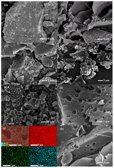 The morphologies of the obtained porous carbons were characterized by SEM. As depicted in Figure 2a, the PSB featured a stacked structure composed of lamellar structures with diameters ranging from tens of micrometers and thicknesses varying from hundreds of nanometers to a few micrometers. Given pyrolysis and the partial removal of organic compounds such as collagen and hemicellulose, the surface of the PSB also presented poor pore structure. Pre-carbonization at a moderate temperature (400 °C) ensured the controlled pyrolytic activation process and a high yield of SNPBs (approximately 13–20%), which was considerably higher than that of one-step activated Spirulina (~0.2%) [25,26]. KOH played crucial roles in carbon activation and reacted with carbon as expressed in the following equation [27,28]: