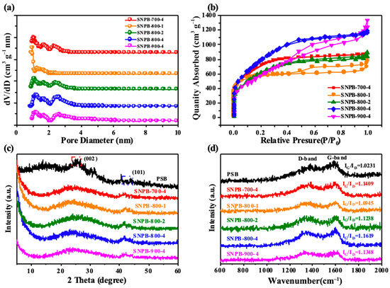 (a) Pore size distributions of SNPBs. (b) Nitrogen adsorption–desorption isotherms of SNPBs. (c) XRD patterns of PSB and SNPBs. (d) Raman spectra of PSB and SNPBs.