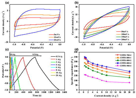 The electrochemical performance of SNPBs as electrode materials was first evaluated in a three-electrode system with 6 M KOH as the electrolyte. The cyclic voltammetry (CV) curves were assessed in a potential window from −1 to 0 V with a scan rate of 50 mV s−1 (Figure S1, Supporting Information). The CV curves of SNPB-800-4 exhibited the largest area and most rectangular shape, which were characteristic features of typical EDLCs. The CV curves of SNPB-800-4 were investigated at different scan rates (Figure 5a,b). At low scan rates (5–50 mV s−1), enhanced diffusion control capacitance was observed because the electrolytic charge could efficiently diffuse to the electrode surface. However, as the scan rate increased from 50 mV s−1 to 200 mV s−1, the rectangular and symmetric shapes of the CV curves became slightly distorted. This distortion was primarily caused by the limited accessibility of active electrode material particles at high scan rates [6]. The charge–discharge performance of SNPBs prepared under different activation temperatures was investigated at a current density of 1 A g−1 (Figure S2, Supporting Information). SNPB-X-4 (X = 700, 800, 900) exhibited almost symmetrical isosceles triangles, indicating good capacitive behavior [41]. SNPB-800-4 had the longest charge–discharge time, which implied its maximum specific capacitance (Equation (1)). Additionally, the charge–discharge performance of SNPB-800-4 was evaluated at a current density range of 0.5–20 A g−1 (Figure 5c). The pseudocapacitive behavior of N-containing functional groups in SNPB-800-4 resulted in a constant-current charge–discharge curve that was not a strictly symmetric isosceles triangle. The curve was slightly distorted because of the good reversibility and conductivity of SNPB-800-4. The bending of the charging curve of SNPB-800-4 at high voltage was not remarkable because of the increase in potential affected ion transport [12]. Longer charging and discharging times at low current densities were due to the sufficient time for electrolyte ions to enter and diffuse into the electrode’s pores compared with those at high current densities [15]. This behavior further demonstrated the excellent electrochemical performance of SNPBs in supercapacitor applications.