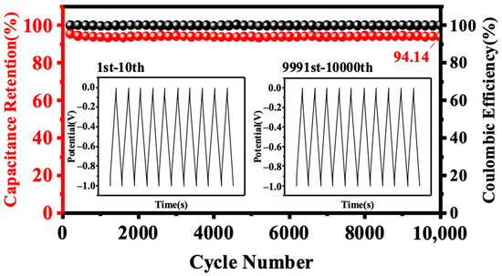 As presented in Figure 5d, the specific capacitances of the SNPB electrodes were calculated from the charge–discharge curves at various current densities. Notably, the specific capacitance of SNPB-800-4 reached 348.5 F g−1 at a current density of 1 A g−1. The ability to maintain excellent specific capacitance even at high current densities serves as evidence of the superior rate performance exhibited by the SNPB-800-4 electrode material. At a current density of 10 A g−1, SNPB-800-4 had a capacitance retention of 94.14% after 10,000 cycles (Figure 6), which demonstrated its good cycling stability. The exceptional electrochemical performance of SNPB-800-4 could be attributed to these reasons: (1) the ultra-high SSA (2923.7 m2 g−1) and total pore volume (1.8448 cm3 g−1) greatly promoted the diffusion rate of electrolyte ions [53]. The unique hierarchical structure of SNPB-800-4 and optimized PSD provided low resistance paths for fast ion transport, which also greatly promoted electrolyte accessibility to the surface of the micropores. (2) In situ doping of heteroatomic oxygen (13.78%) and nitrogen (2.55%) promoted the formation of active N-doped sites and the generation of pseudocapacitance [54].