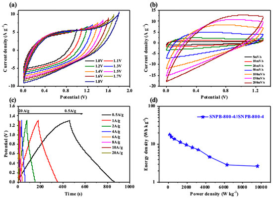 (a) CV curves of SNPB-800-4//SNPB-800-4 at different voltage windows of 1 to 1.8 V. (b) CV curves of SNPB-800-4/SNPB-800-4 at different scanning rates of 5 to 200 mV s−1 under a 1.3 V voltage window. (c) GCD curves at different densities from 0.5 to 20 A g−1. (d) Ragone plot of SNPB-800-4//SNPB-800-4.