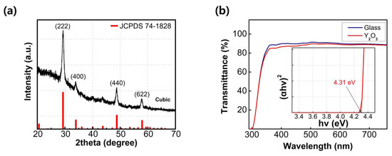 (a) GIXRD spectra of sol–gel-processed Y2O3 films and (b) transmittance spectra of sol–gel-processed Y2O3 films; the inset shows (ahv)2 vs. photon energy.