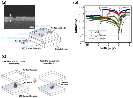 Figure 3a presents a schematic of the fabricated RRAM devices; the inset shows the cross-sectional SEM image of Y2O3 films on ITO/glass substrates. Figure 3b displays representative I–V characteristics of the fabricated Y2O3 RRAM devices with different levels of compliance current. To observe the set/reset behavior, the voltage of the TE was swept from −15 V to 5 V, with the bottom electrode (BE) grounded. The read voltage was set at 0.1 V. The initially obtained resistance values were relatively high, indicating HRS. At a specific voltage known as the SET voltage, the current abruptly increased, resulting in low-resistance values, referred to as the LRS. When a voltage was applied from positive to negative values, known as the RESET voltage, the LRS turned back into the HRS. Notably, all fabricated Y2O3-based RRAM devices demonstrated apparent bipolar switching behavior without requiring an unwanted forming process. This distinguishes them from OV-rich metal-oxide-based RRAMs or Ag/Cu electrode-based RRAMs, often necessitating an additional forming process [24,25]. The Y2O3 films formed in this study exhibited some oxygen vacancy formation, and the use of Ag TE facilitated the easy formation of conductive filaments (CFs) without the need for a high-voltage forming process. This mechanism is based on conductive bridge random-access memory, which operates through the reduction and oxidation of Ag. Comparisons were made between Y2O3 RRAM devices with Ag TE and those with Au TE. The RRAM with Au TE did not exhibit evident RRAM characteristics since Au cannot form conductive bridges similar to Ag due to its low reactivity [14]. In contrast, the diffusive nature of Ag allowed it to penetrate the switching layer easily, enabling the formation of CFs. In addition, the Y2O3 switching layer contained abundant OV, which facilitated the formation of CFs without the need for applying a forming voltage. During the set process, a negative bias of −15 V was applied to the Ag TE, resulting in the HRS state. Upon applying a positive bias, Ag atoms lost electrons through an oxidation reaction and formed cations (Ag → Ag+ + e−). These cations then migrated to the BE and received electrons through a reduction reaction (Ag+ + e− → Ag), leading to reduced Ag atoms in the switching layer. Once a particular voltage was reached, the TE and the BE were connected by conductive bridges made of Ag, transitioning the device to LRS. An abrupt increase in current at the SET voltage corresponds to the set process. Conversely, when the voltage applied to the TE was swept toward −15 V, the current dropped suddenly at the RESET voltage. This is attributed to the oxidation reaction of the Ag atoms, facilitated by a thermal electrochemical process. The oxidized Ag cations then returned to the TE, causing the conductive bridges to dissolve, thereby disconnecting the TE and the BE and returning the device to its initial HRS state.